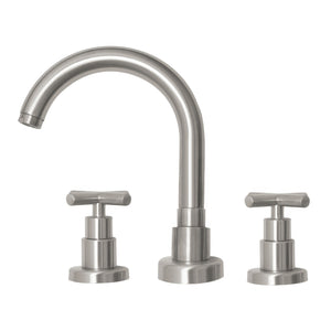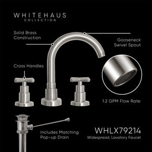 Whitehaus Collection offers smooth lines and functionality with Luxe Bath. The luxurious design of the Luxe widespread lavatory faucet with tubular swivel spout, cross handles and pop-up waste in brushed nickel-PVD, adds character to any décor.