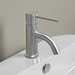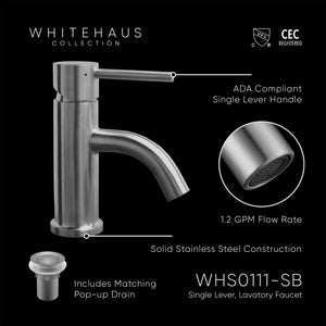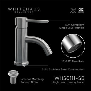 The Waterhaus single hole, single lever lavatory faucet in brushed stainless steel, comes with a matching pop-up drain. Designed to complement any decor, Waterhaus represents the best of its kind.