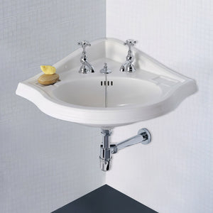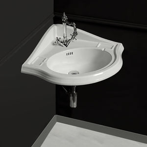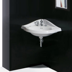 The Isabella Collection is offered in a variety of shapes and sizes. The smooth, seamless design creates a modern, contemporary focal point, making it the perfect choice for any décor. Complement any décor with this Corner Wall Mount Lavatory Sink with integrated oval bowl complete with backsplash, dual soap ledges and overflow.