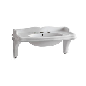Whitehaus Collection displays high levels of sophistication and serenity with the Isabella Collection. Crafted from the highest quality vitreous china available, these basins are as durable as they are luxurious. The Isabella Collection is offered in a variety of shapes and sizes. The smooth, seamless design creates a modern, contemporary focal point, making it the perfect choice for any décor. The AR864-MNSLEN is a large, rectangular wall mount basin with an elegant backsplash, and vanity space on each side of the integrated oval bowl. This sink replaces the need for a vanity, and is the ideal solution for a space that isn’t able to accommodate cabinet storage. Complement any decor with this Wall Mount Lavatory Sink with ceramic shelf support.