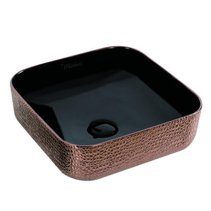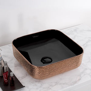 Isabella Plus Collection exceeds expectations with the exquisite additions offered. Combining both beauty and durability, these above mount sinks are crafted from the highest quality vitreous china available. The fine craftsmanship shines through with its luxurious, unique and bold seamless design. This square above mount sink features an embossed, rose gold tone exterior and smooth solid black interior, has a center drain and no overflow. Redefine your home with a new level of sophistication by enhancing your bathroom décor with this elegant Isabella Plus above mount basin.