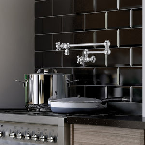 The double jointed retractable wall mount pot filler with cross handles will bring a unique elegance into your home. Available in exquisite finishes to fit your design choice: Polished Chrome, Polished Nickel, Brushed Nickel, Antique Brass, Oil Rubbed Bronze