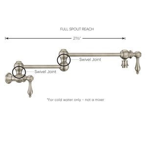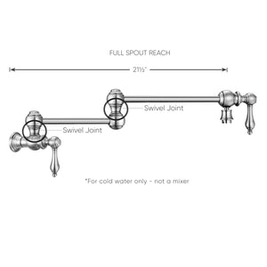 The double jointed retractable wall mount pot filler with lever handles will bring a unique elegance into your home. Available in exquisite finishes to fit your design choice: Polished Chrome, Polished Nickel, Brushed Nickel, Antique Brass, Oil Rubbed Bronze.