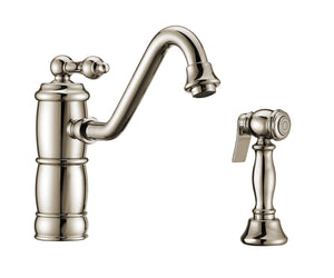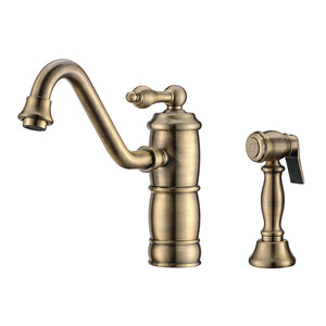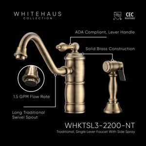Complement your kitchen décor with this Vintage III Plus single lever kitchen faucet with traditional swivel spout and solid brass side spray. Available in the following finishes: Polished Chrome, Brushed Nickel, Antique Brass, Oil Rubbed Bronze and Polished Nickel.