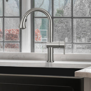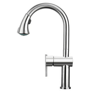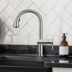 Waterhaus single hole faucet with a gooseneck swivel spout, lever handle and a pull-down spray head.