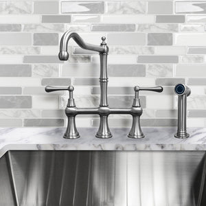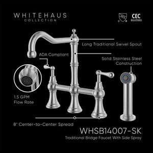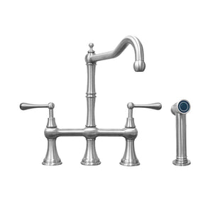 Functional for many layouts, the Waterhaus lever handle bridge faucet with traditional swivel spout and solid side spray represents the best of its kind.