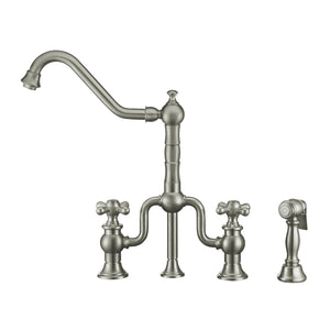 Twisthaus Plus Kitchen Faucets will awaken your senses with their unique traditional design. Worthy of being placed in any home, these bridge faucets are made of solid brass ensuring you quality and durability for years to come. The bridge style kitchen faucet is known best for their simple, clean lines and open spaces. This playful, yet distinctive style has a long traditional swivel spout, solid cross handles and solid brass side spray. Available in your choice of: Polished Chrome, Brushed Nickel, Antique Brass, Oil Rubbed Bronze and Polished Nickel it will make an impression on your kitchen design.
