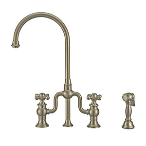 The bridge style kitchen faucet is known best for their simple, clean lines and open spaces. This playful, yet distinctive style has a gooseneck swivel spout, solid cross handles and solid brass side spray.