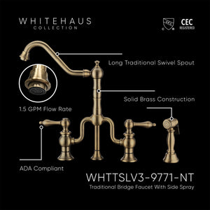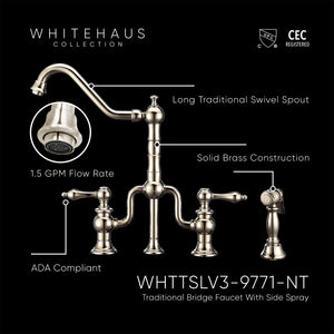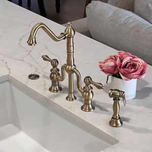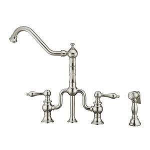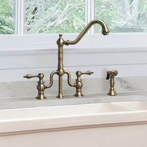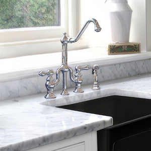 The bridge style kitchen faucet is known best for their simple, clean lines and open spaces. This playful, yet distinctive style has a long traditional swivel spout, solid lever handles and solid brass side spray.
