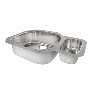 The large D-bowl on the left offers ample space for big items, with efficient drainage from a 3-1/2" rear center drain, while the smaller bowl has a convenient 3-1/2" center drain for multitasking.