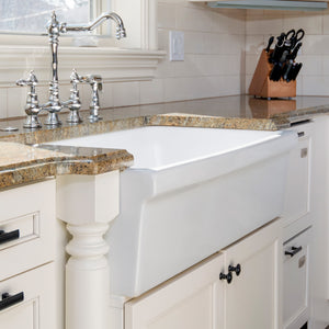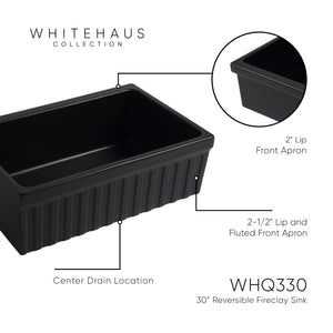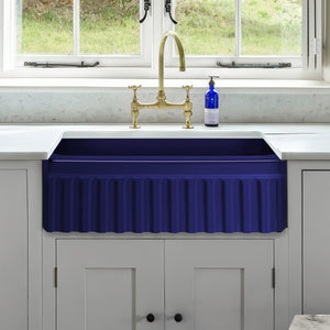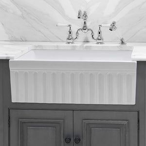 30" reversible fireclay kitchen sink with fluted and decorative 2-1/2" lip front apron on one side, and 2" lip on the other: