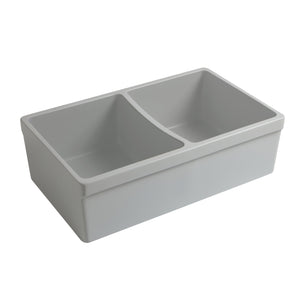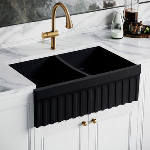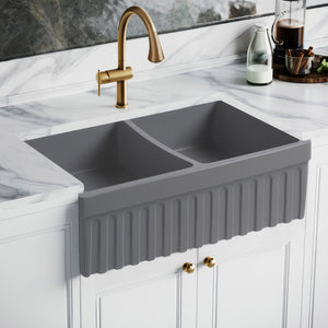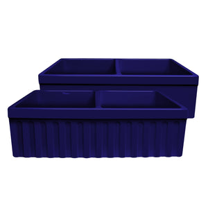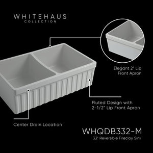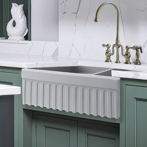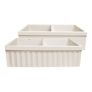 33" reversible double bowl fireclay kitchen sink with fluted front apron and 2-1/2" lip on one side and 2" lip on the other: