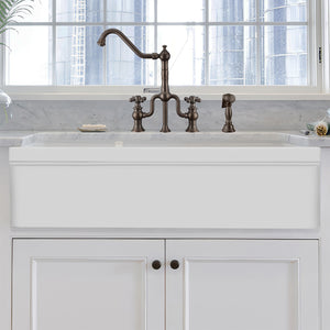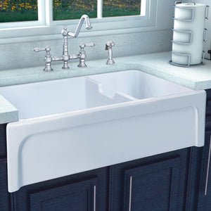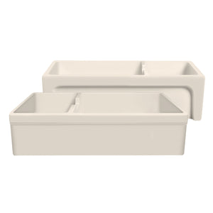 42" large reversible double bowl fireclay kitchen sink with an elegant beveled front apron on one side and plain front apron with a decorative 2-1/2" lip on the other: