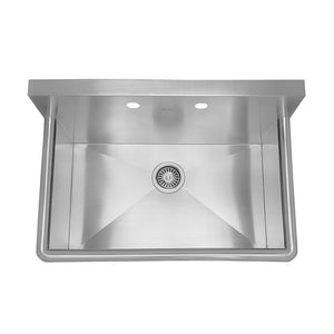 31" Noah's Collection single bowldrop-in or wall mount sink with 8" pre-drilled holes for a wall mount faucet and 3 1/2" rear center drain hole, with four diagonal grooves to channel water directly to the drain.