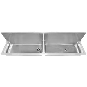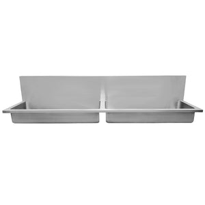72" Noah's Collectionstainless steel double bowl, wall mount utility sinkwith 2 1/2" far right center drain in the left bowl, and 2″ offset drain in the right bowl. It features diagonal grooves to channel water directly to the drain and zero radius corners that ensure easier clean up. Works great in garages, laundry rooms or commercial areas.