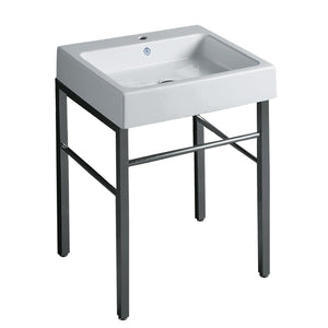 The sleek, minimalist design of the rectangular sink, with its polished chrome leg supports and integrated front towel bar, delivers a clean and contemporary look.