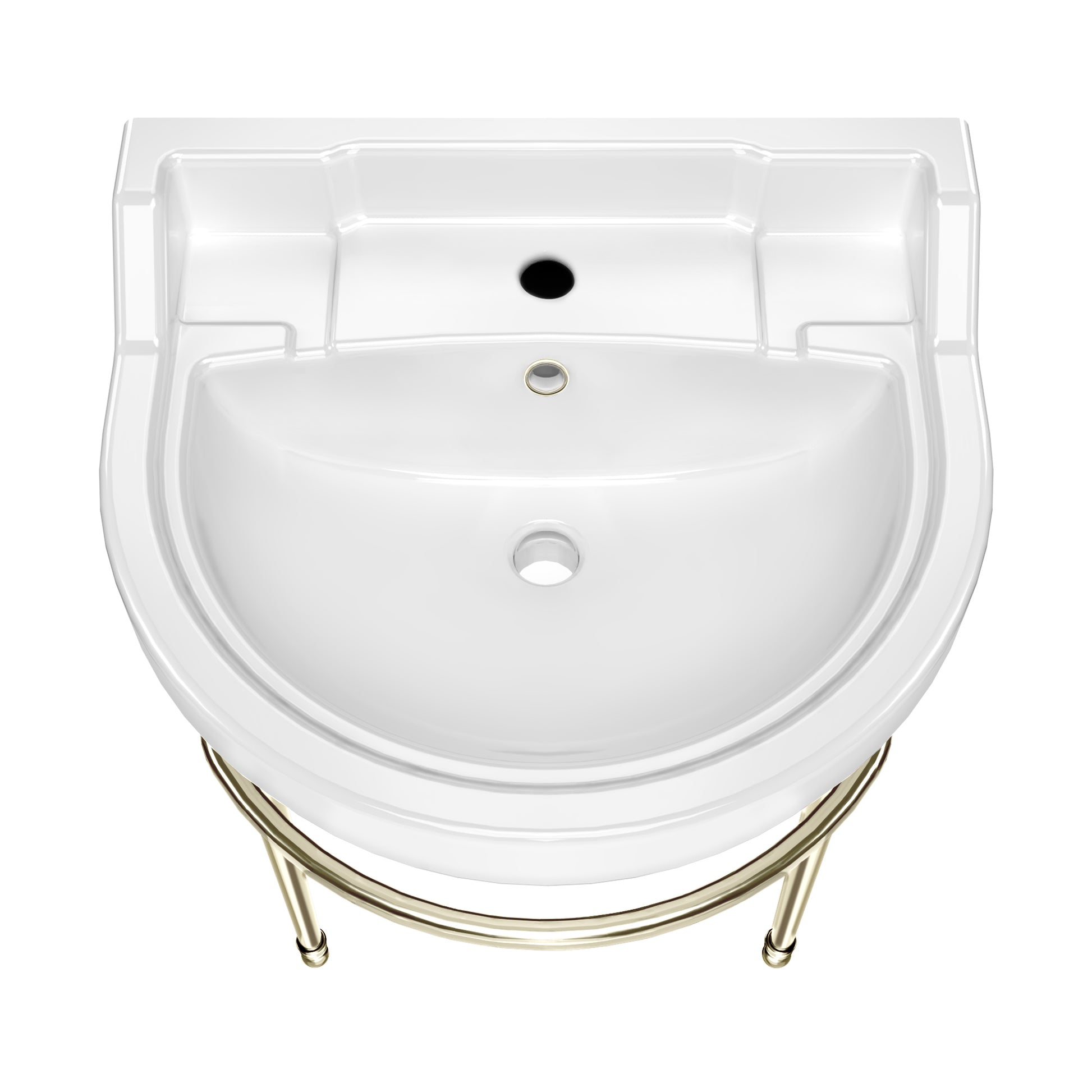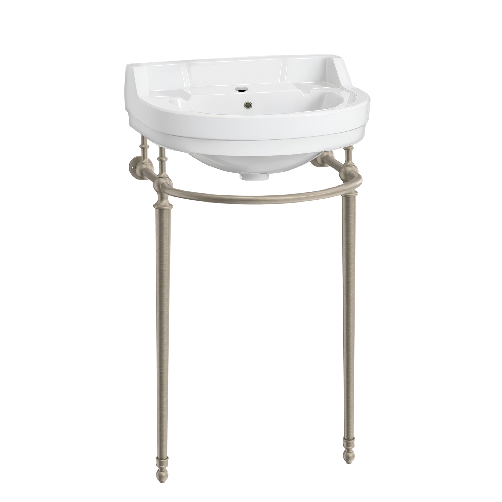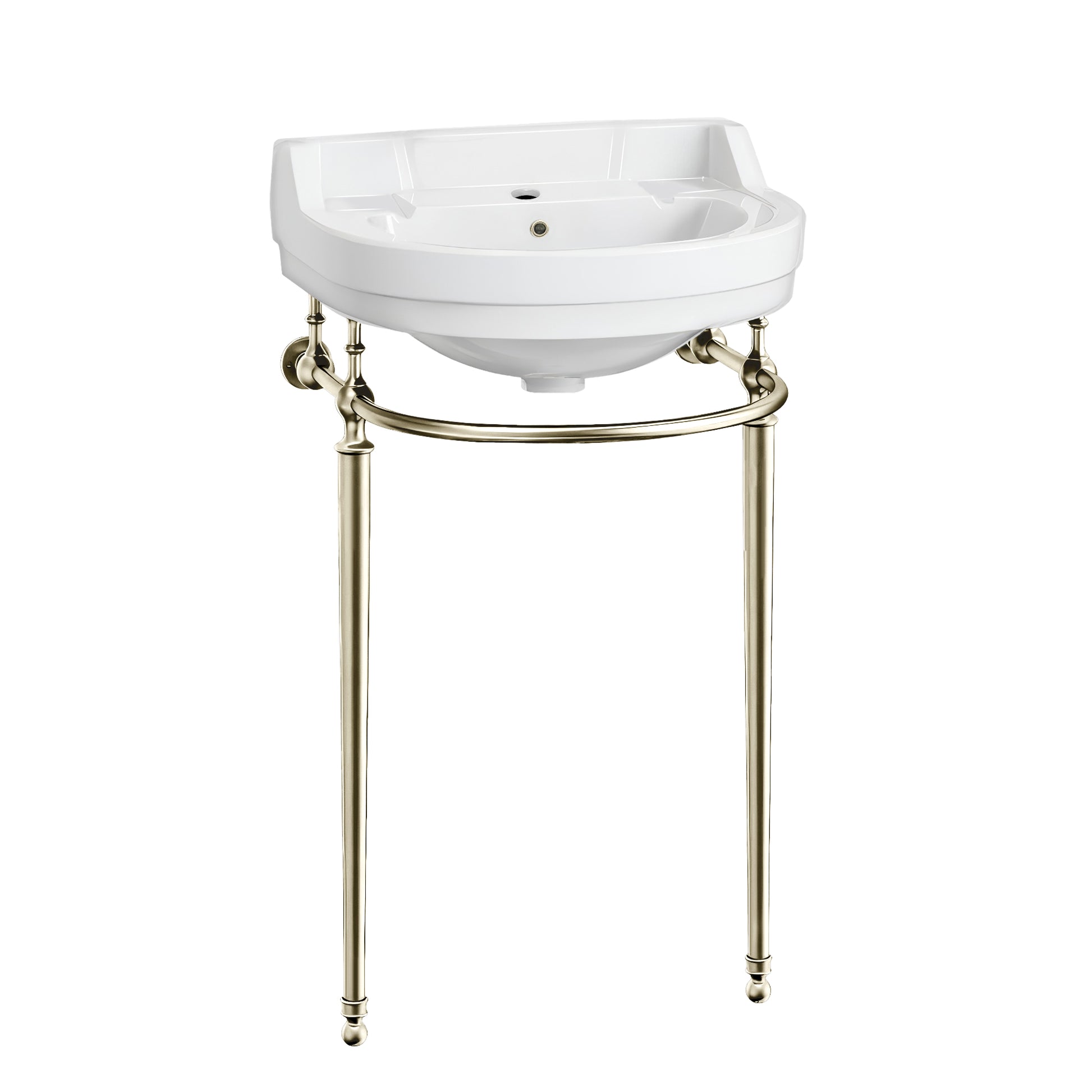 The refined semi-circular basin, paired with solid brass leg supports, creates a striking focal point in any bathroom.