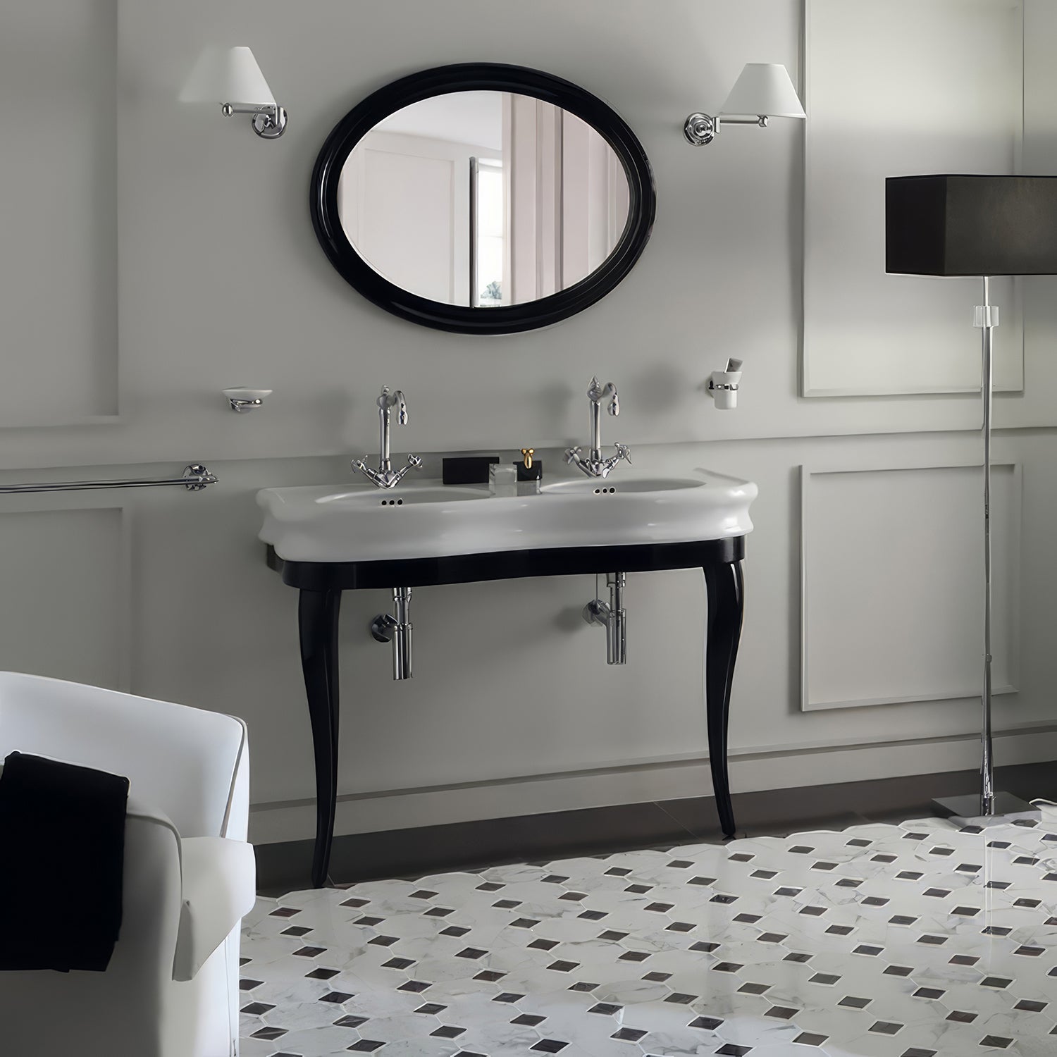 The spacious double bowl design offers ample space, making it an ideal choice for shared bathrooms or lavish powder rooms where luxury meets everyday practicality.