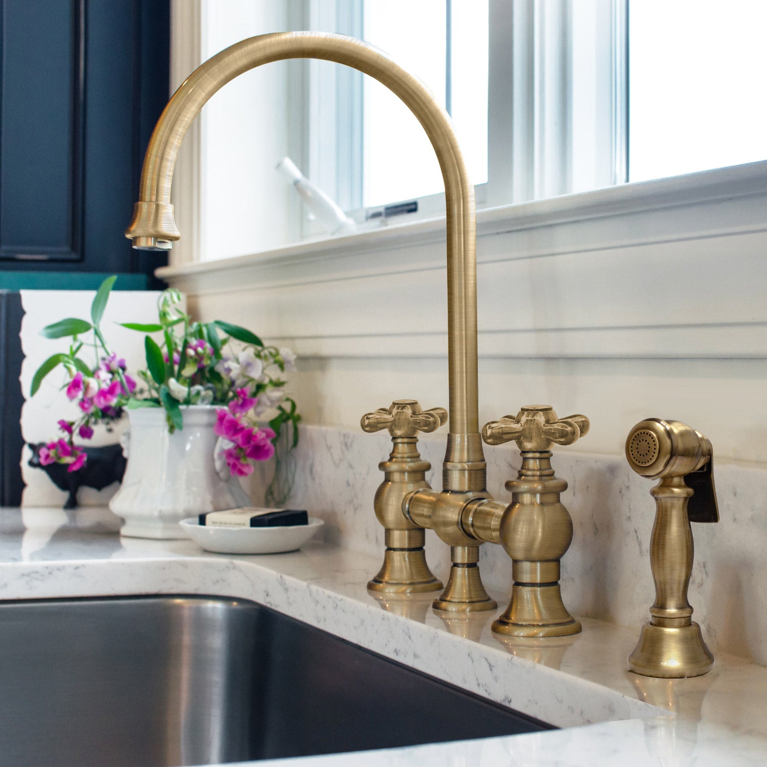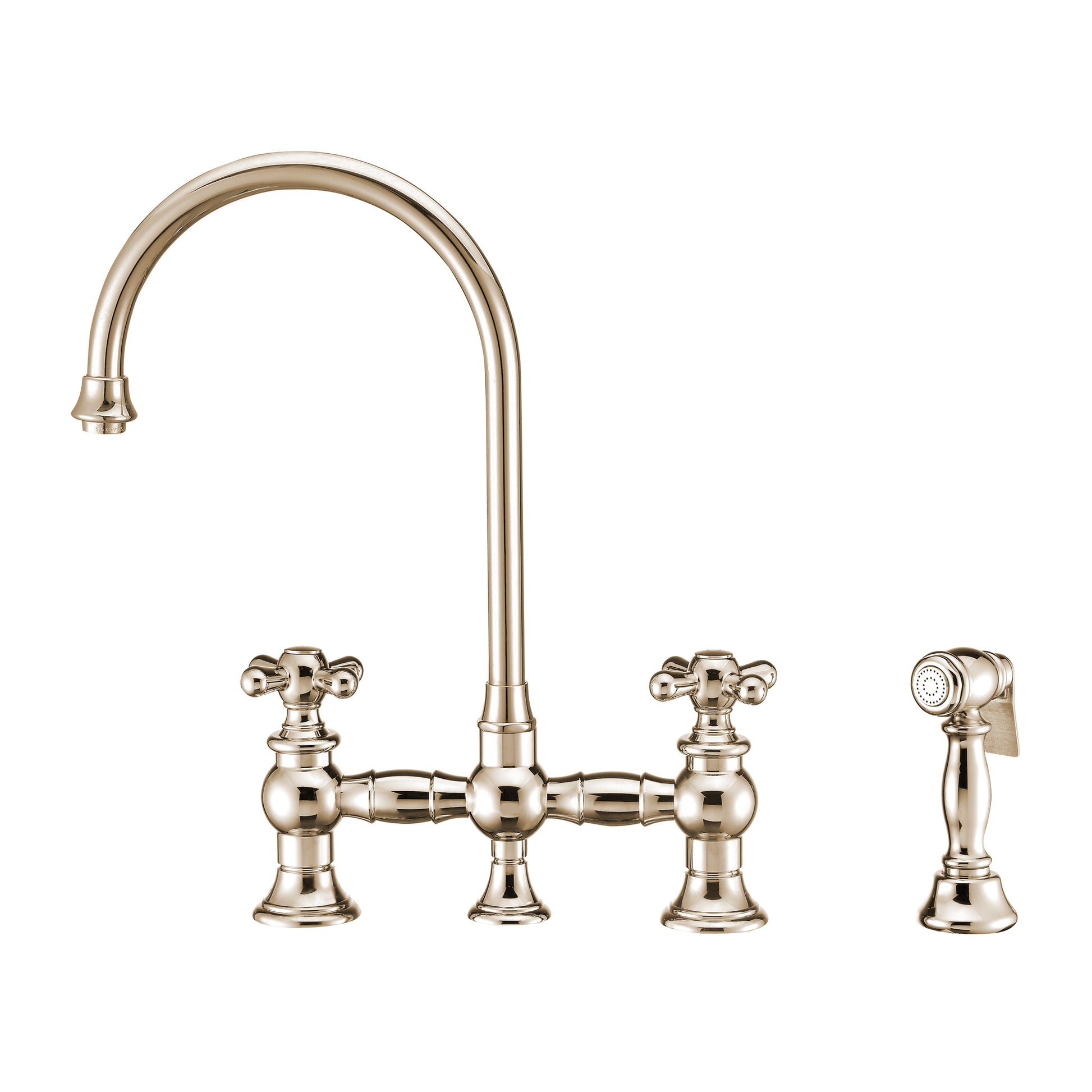 Bridge Faucet with Long Gooseneck Swivel Spout, Cross Handles and Solid Brass Side Spray