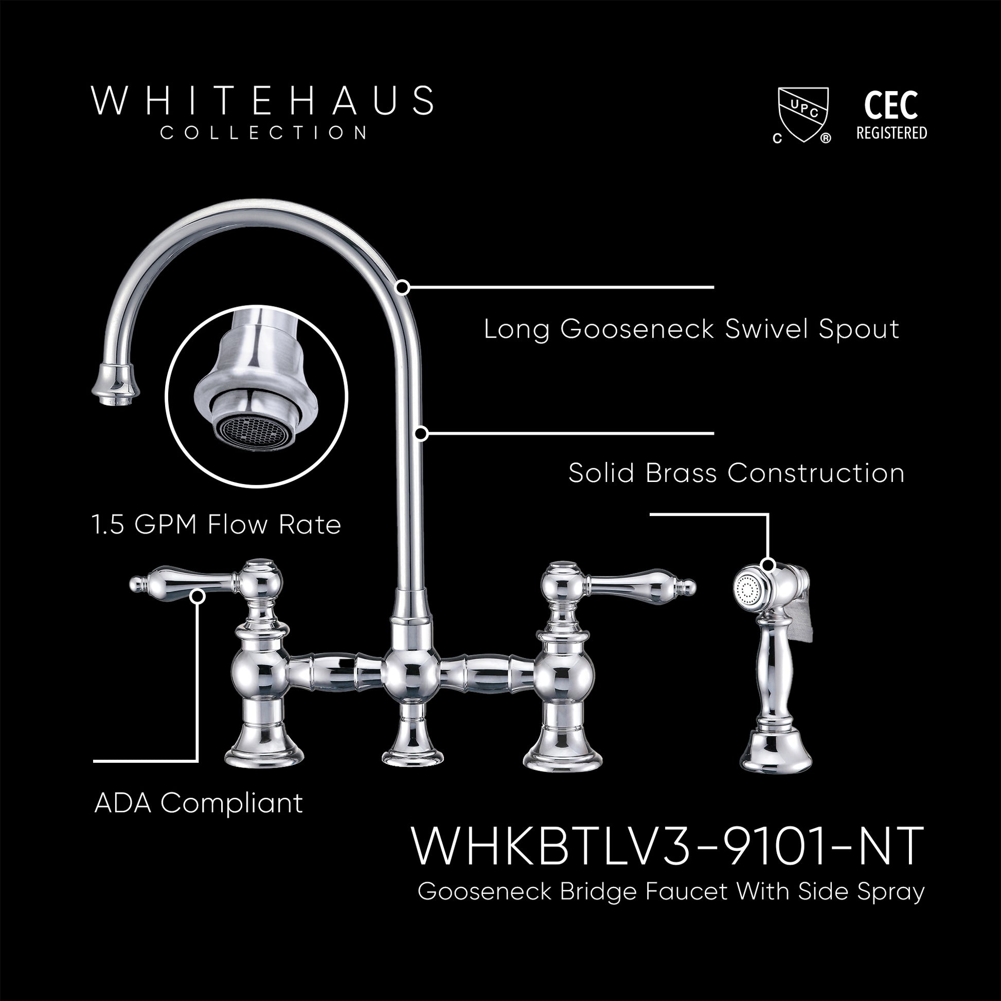 Designed to complement any home, these kitchen faucets are made of solid brass that ensures durability and strength. They feature a long gooseneck swivel spout, solid lever handles, durable solid brass side spray, and added bonus of Watersense compliance with 1.5 GPM water flow.