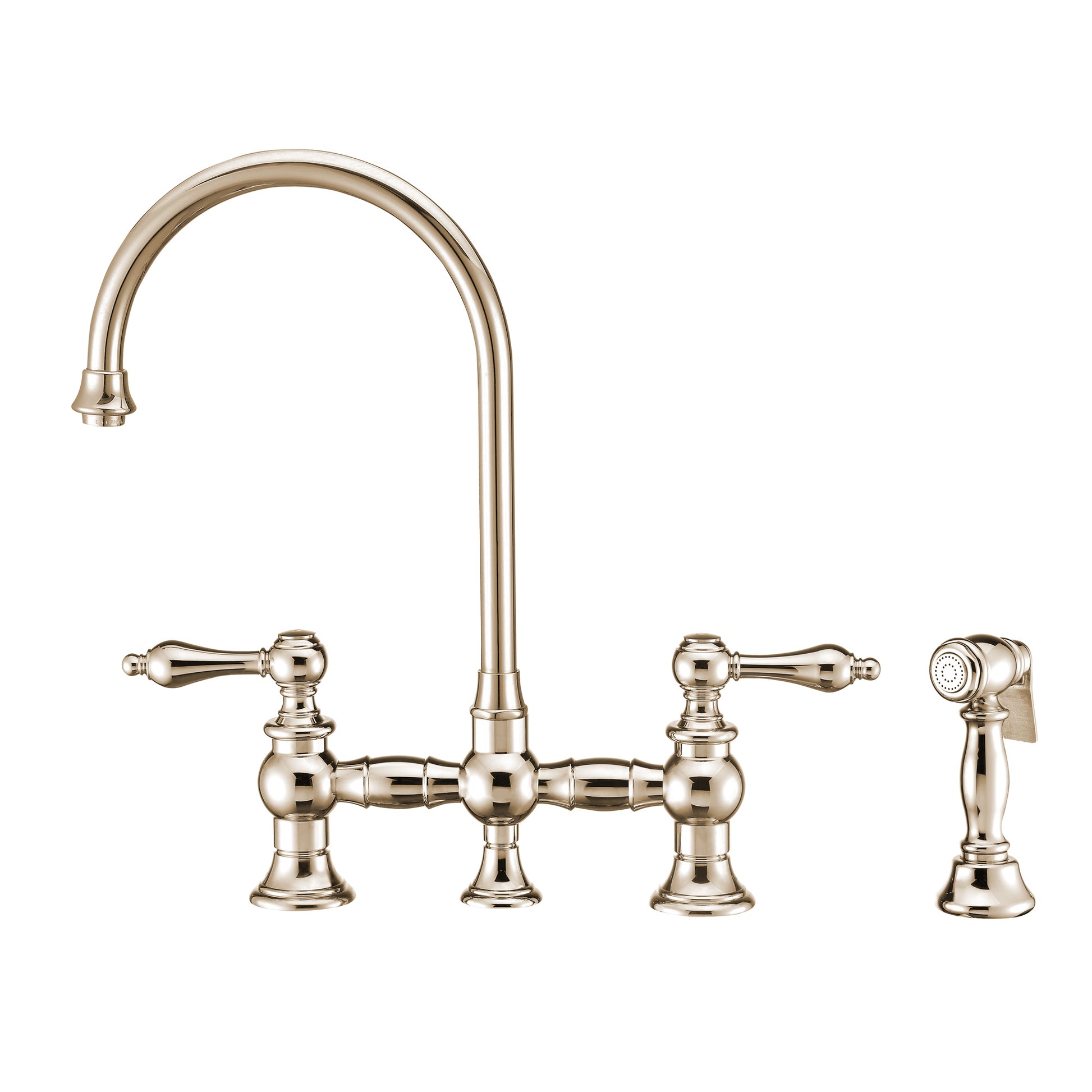 Bridge Faucet with Long Gooseneck Swivel Spout, Lever Handles and Solid Brass Side Spray
