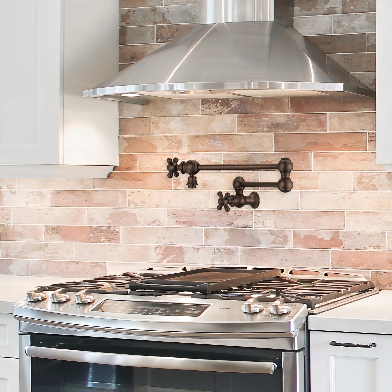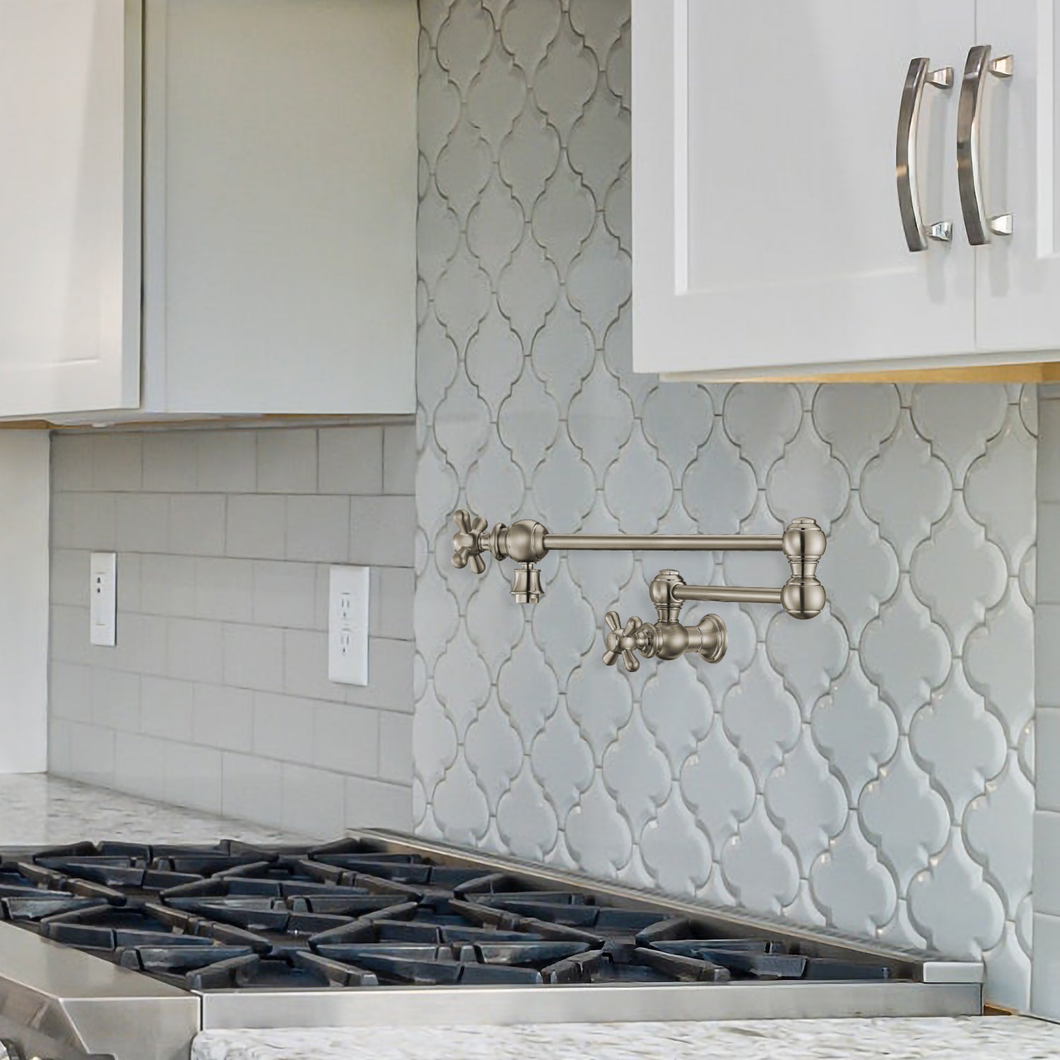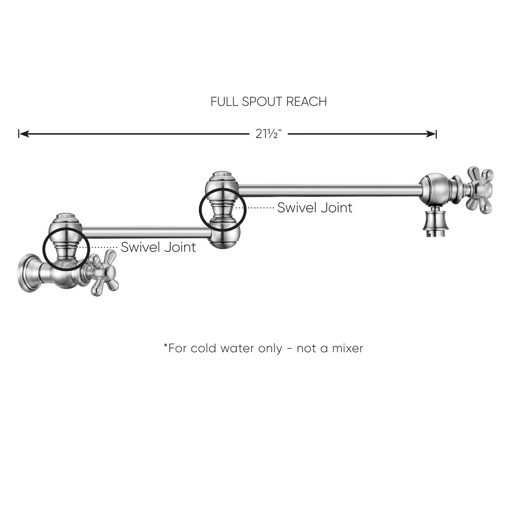 The double jointed retractable wall mount pot filler with cross handles will bring a unique elegance into your home. Available in exquisite finishes to fit your design choice: Polished Chrome, Polished Nickel, Brushed Nickel, Antique Brass, Oil Rubbed Bronze