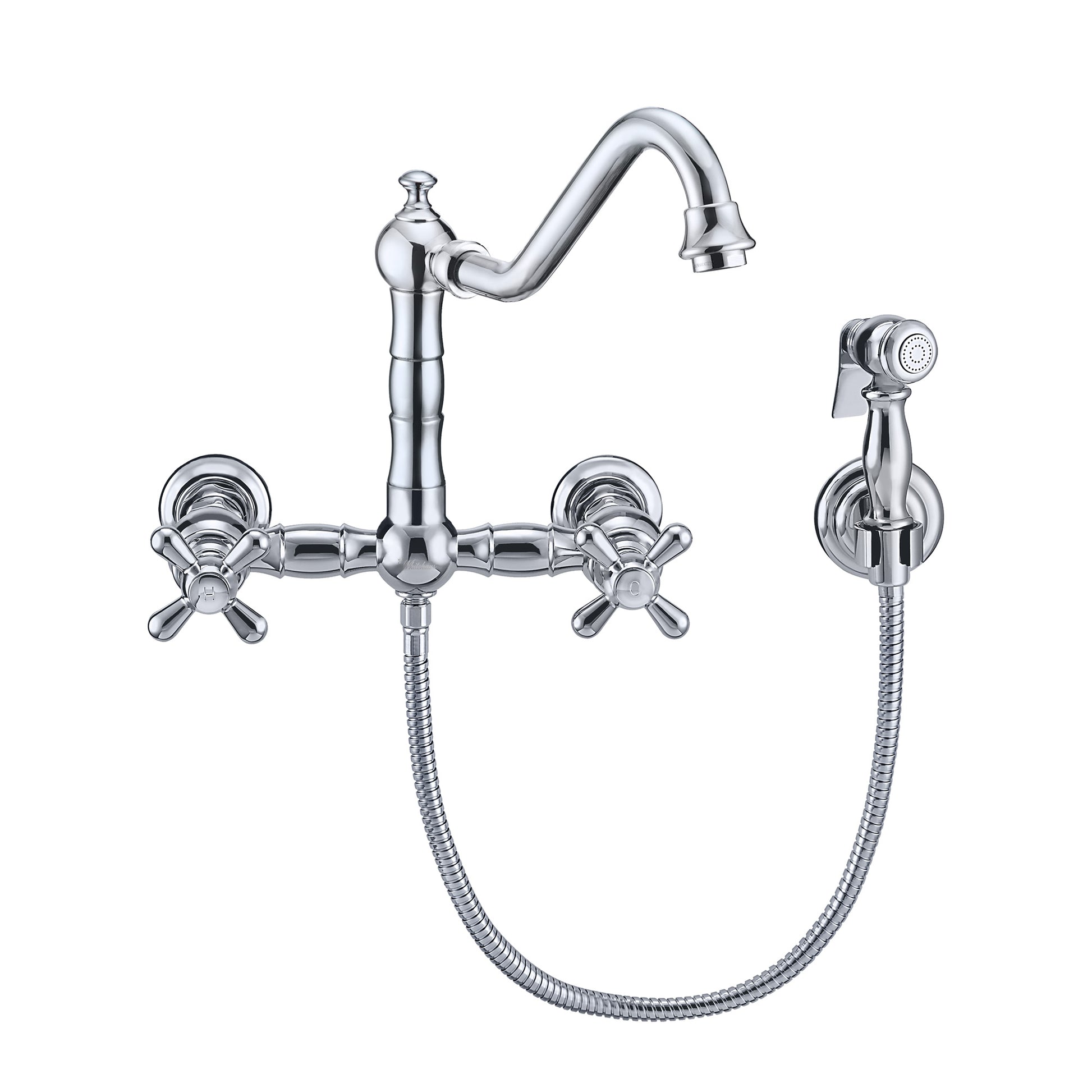 Wall Mount Faucet with a Long Traditional Swivel Spout, Cross Handles and Solid Brass Side Spray