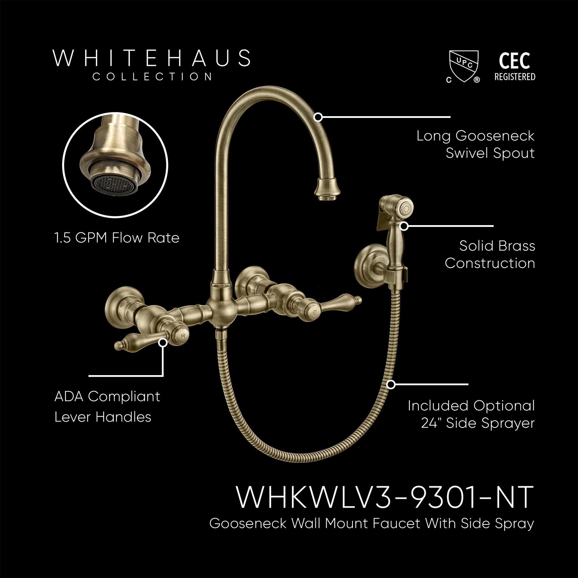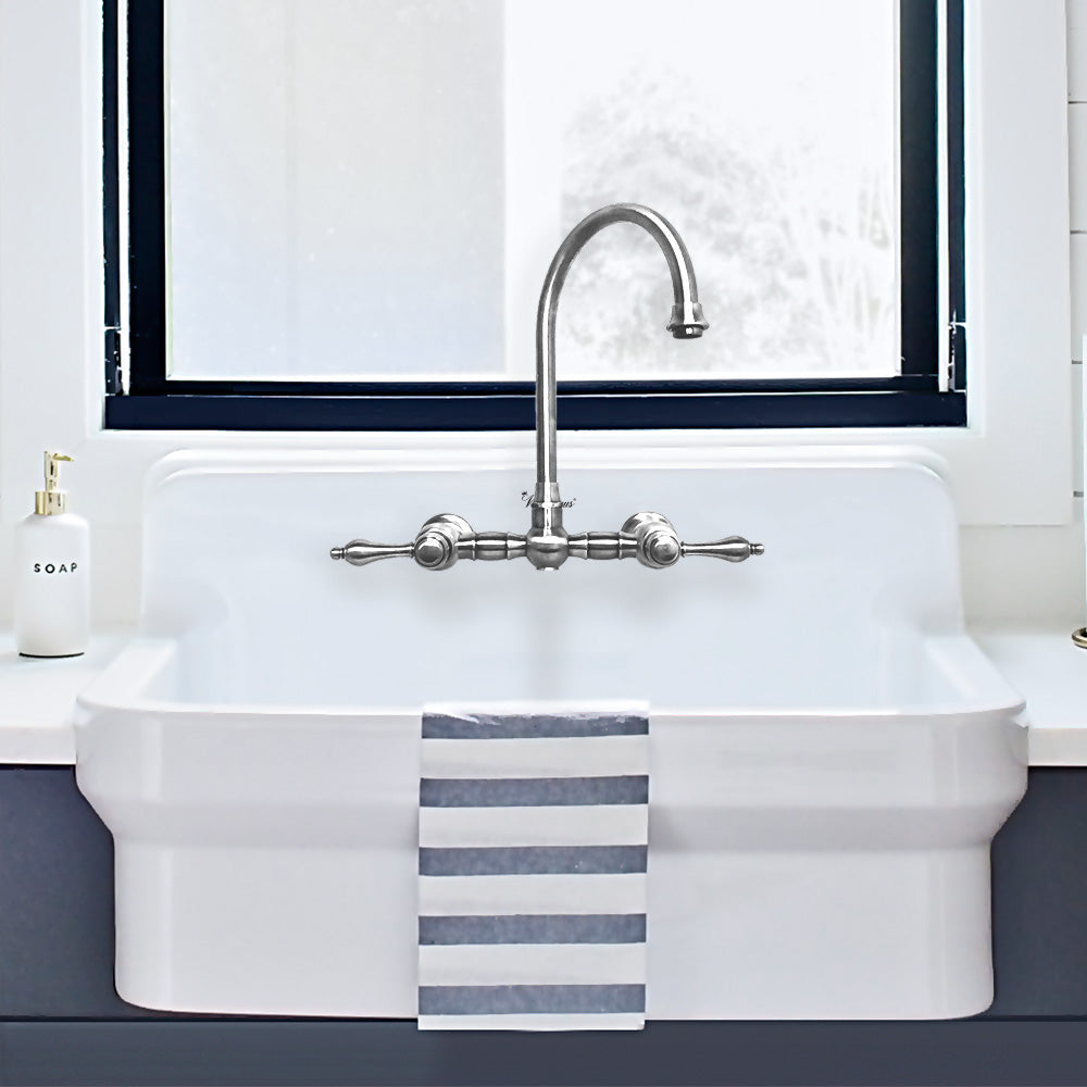 Designed to complement any home, Vintage III Plus kitchen faucets are made of solid brass that ensures durability and strength. This wall mount faucet features a long gooseneck swivel spout and solid lever handles.
