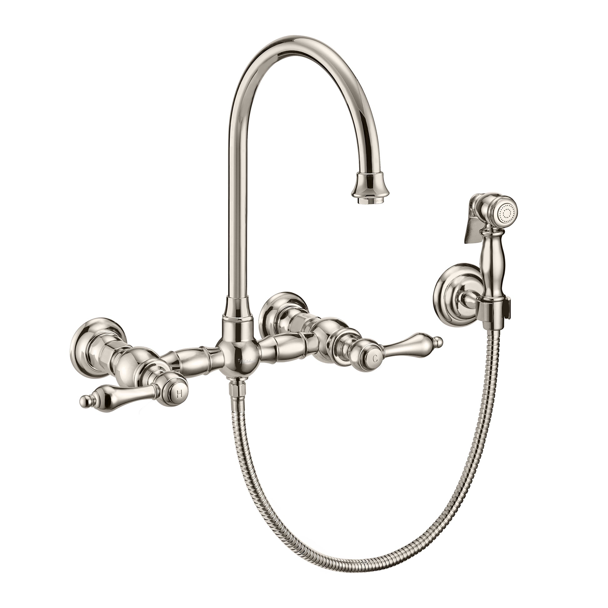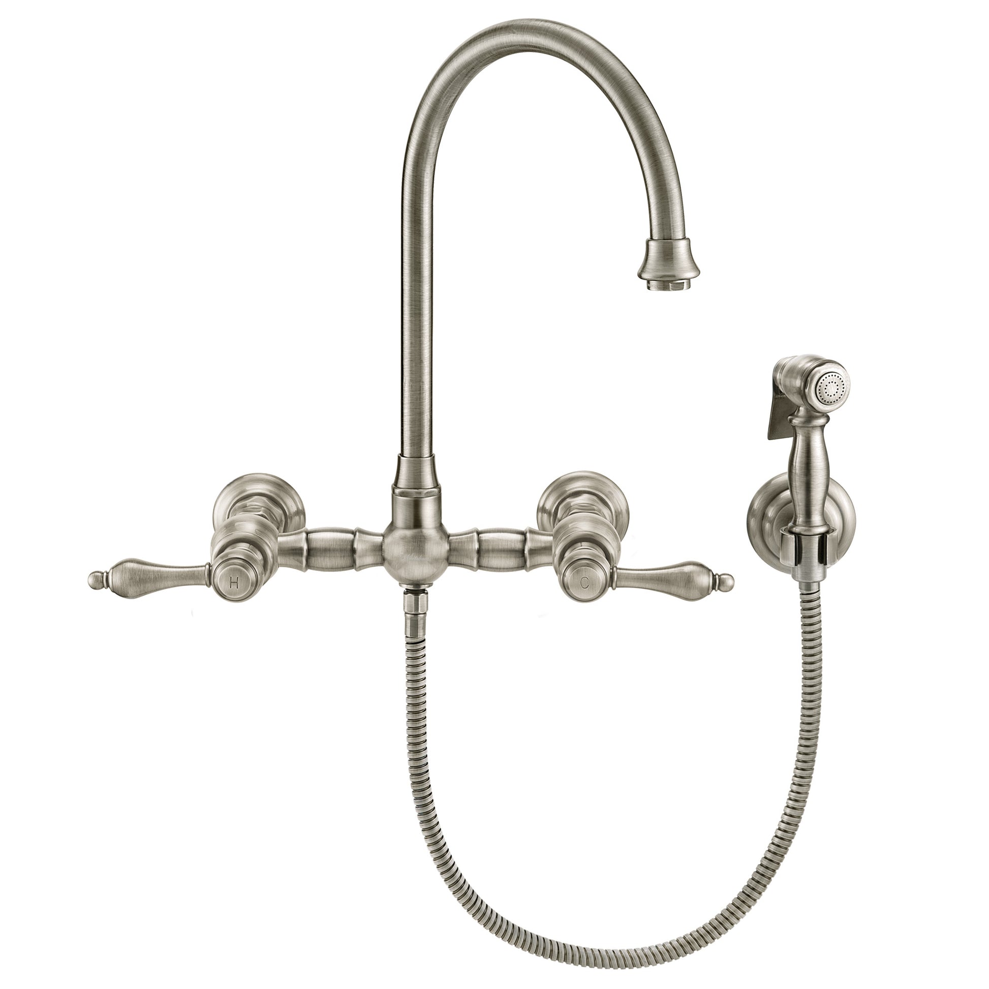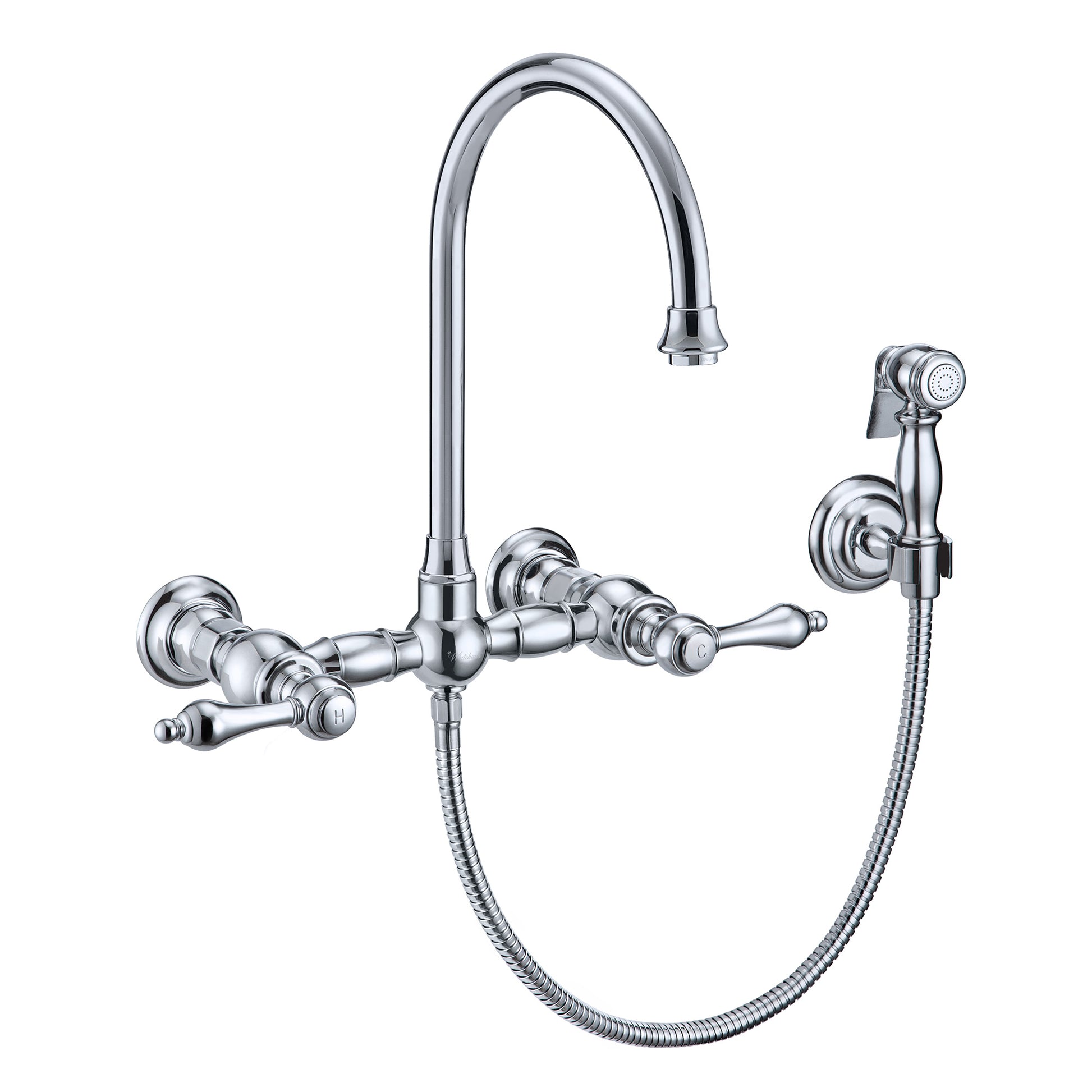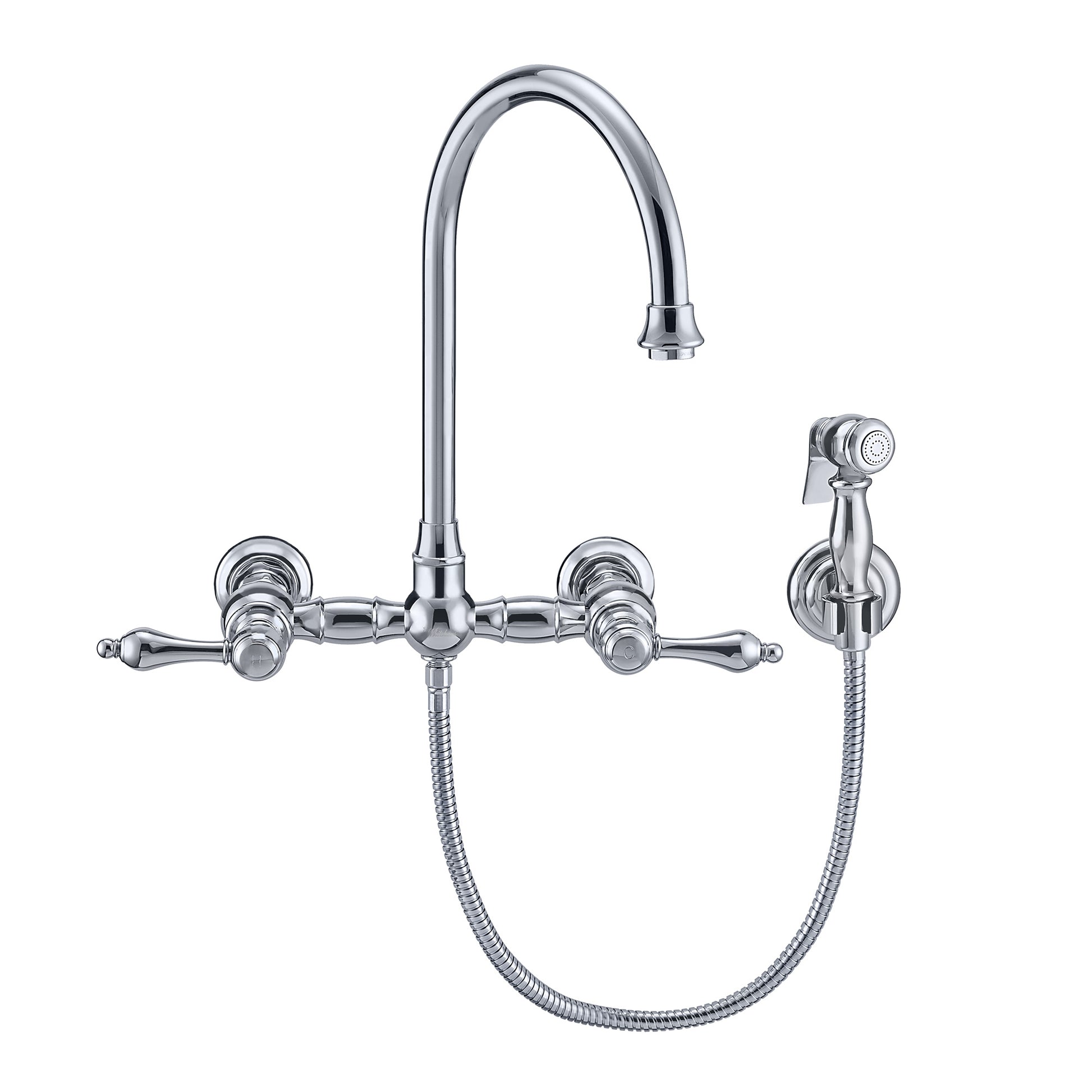 Wall Mount Faucet with a Long Gooseneck Swivel Spout, Lever Handles and Solid Brass Side Spray