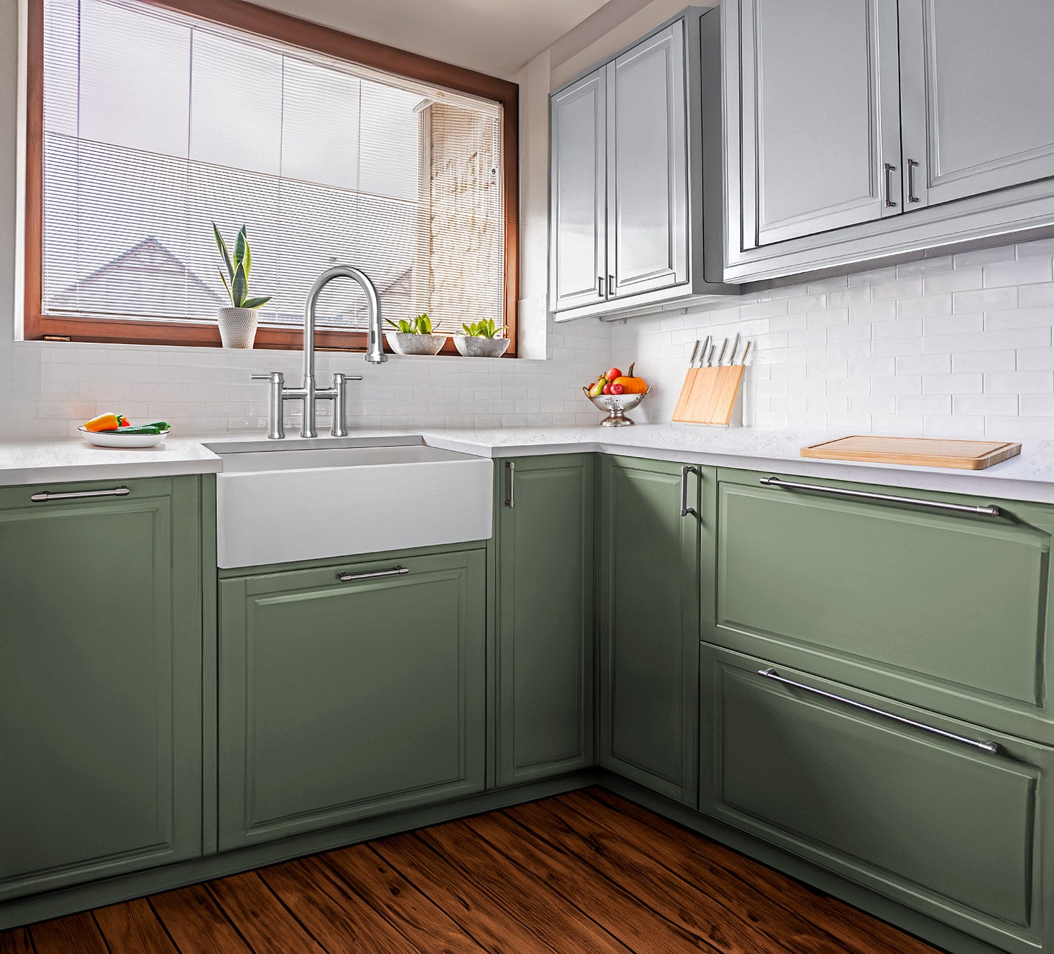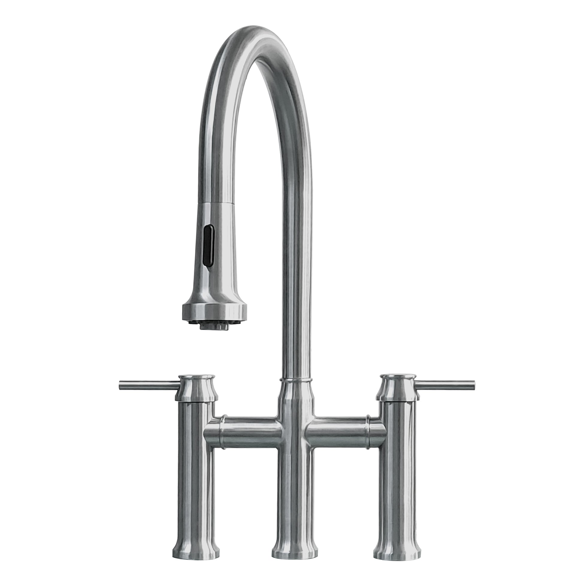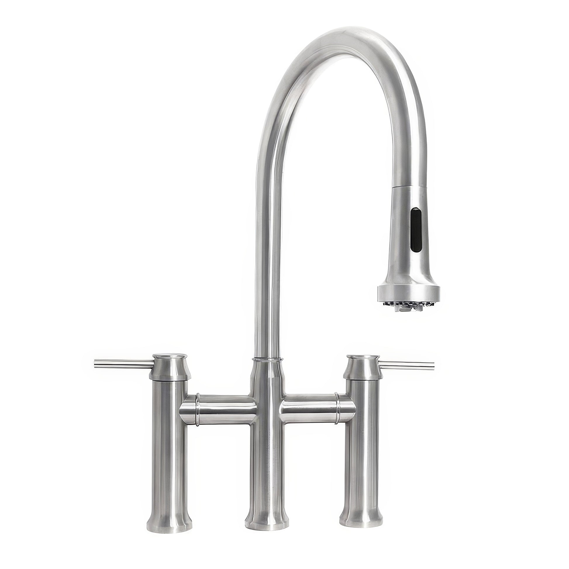 Waterhaus lead-free solid stainless steel bridge faucet with a gooseneck swivel spout, pull-down, two-mode spray head and solid lever handles.