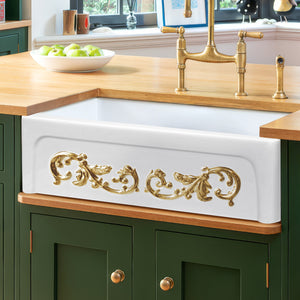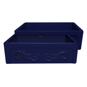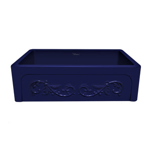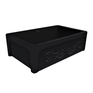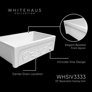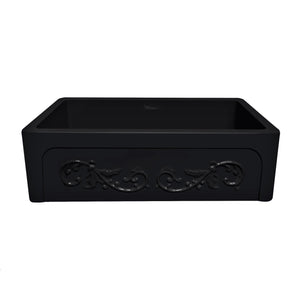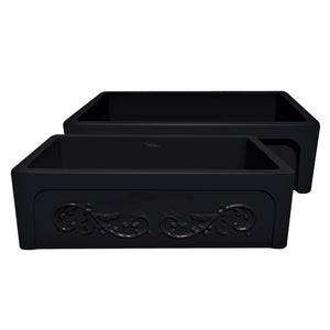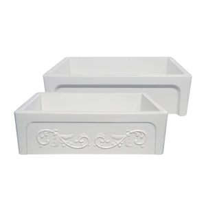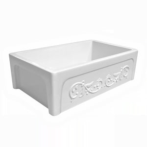 33" reversible single bowl fireclay kitchen sink with an intricate embossed vine design on one side, and an elegant beveled front apron on the other: