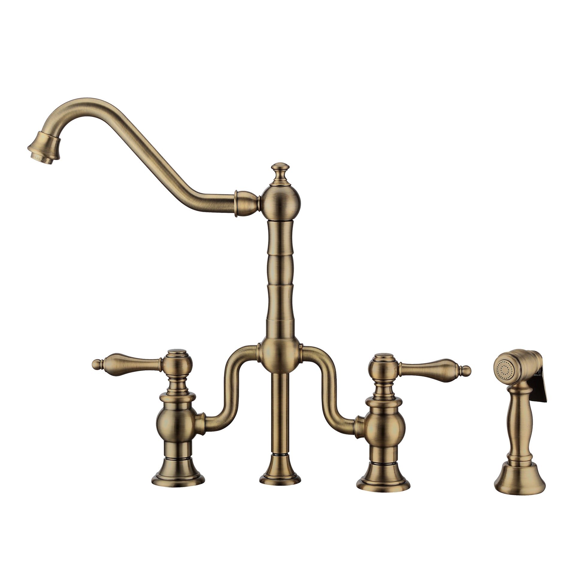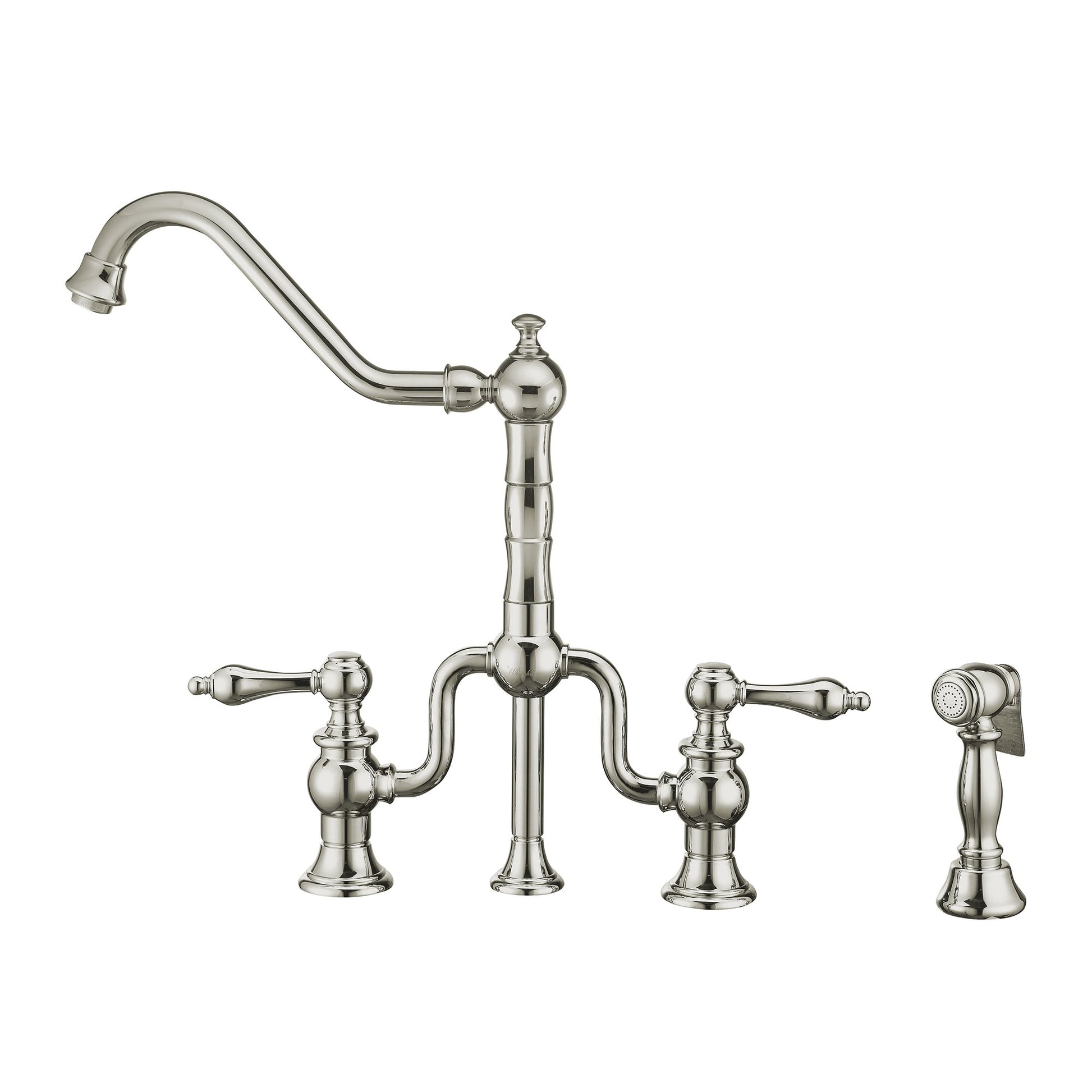 The bridge style kitchen faucet is known best for their simple, clean lines and open spaces. This playful, yet distinctive style has a long traditional swivel spout, solid lever handles and solid brass side spray.