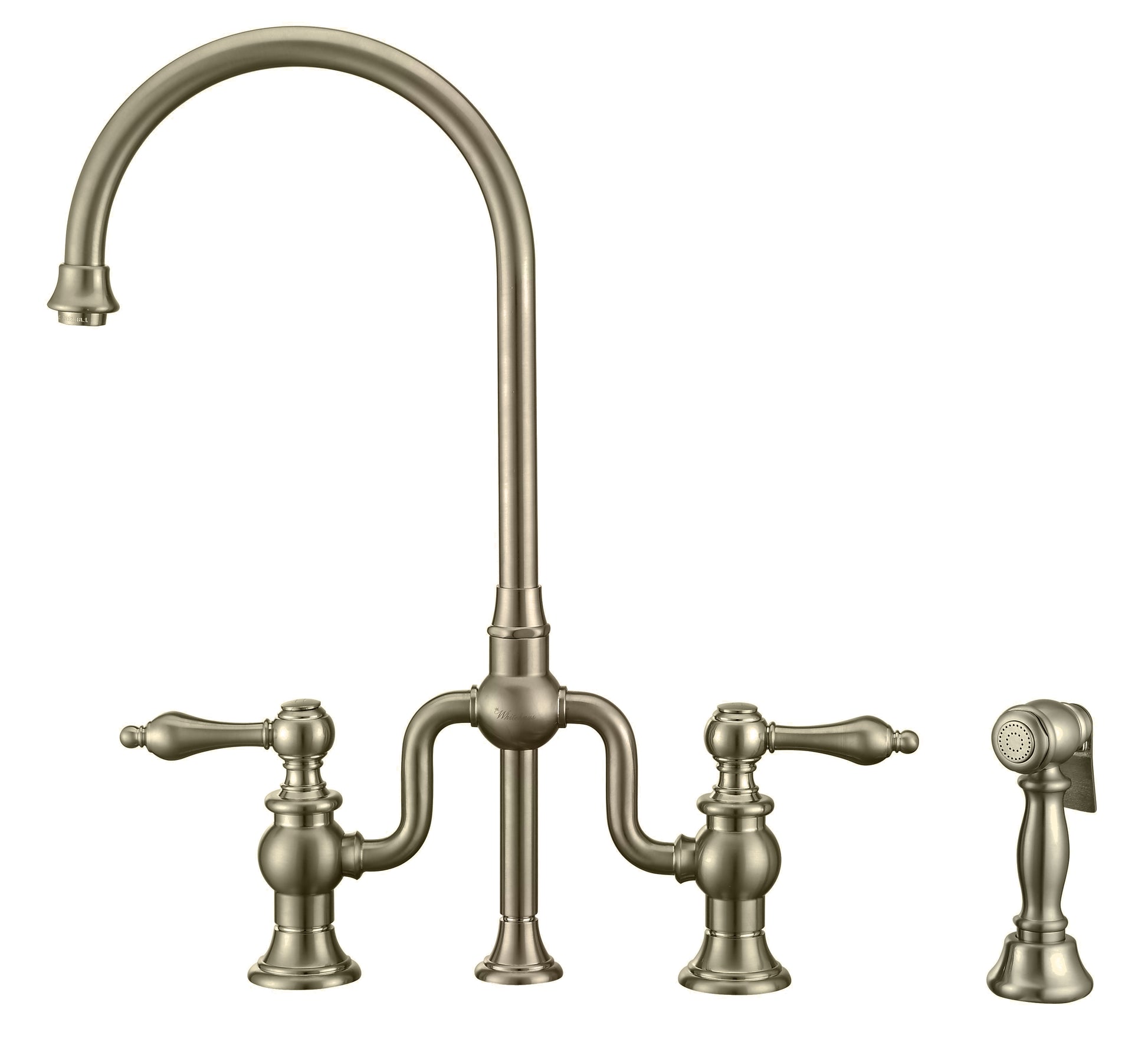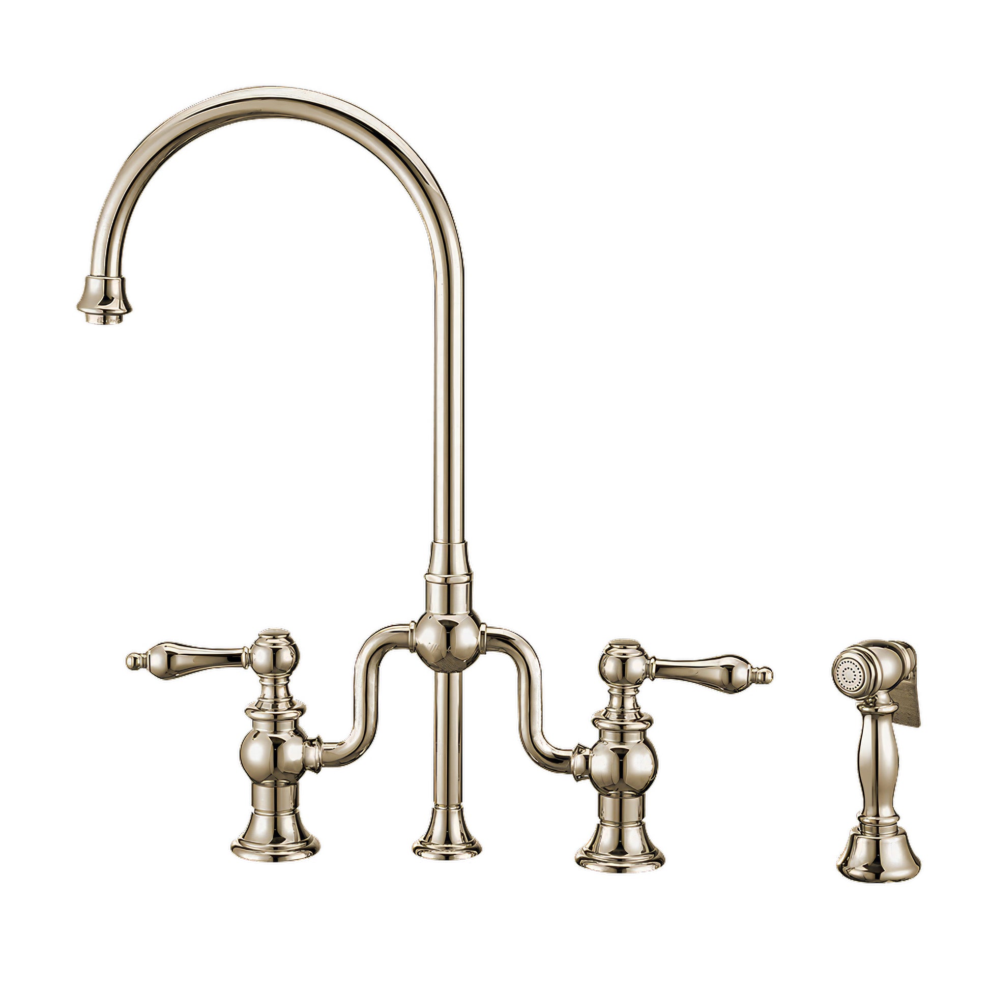 Bridge Faucet with Gooseneck Swivel Spout, Lever Handles and Solid Brass Side Spray
